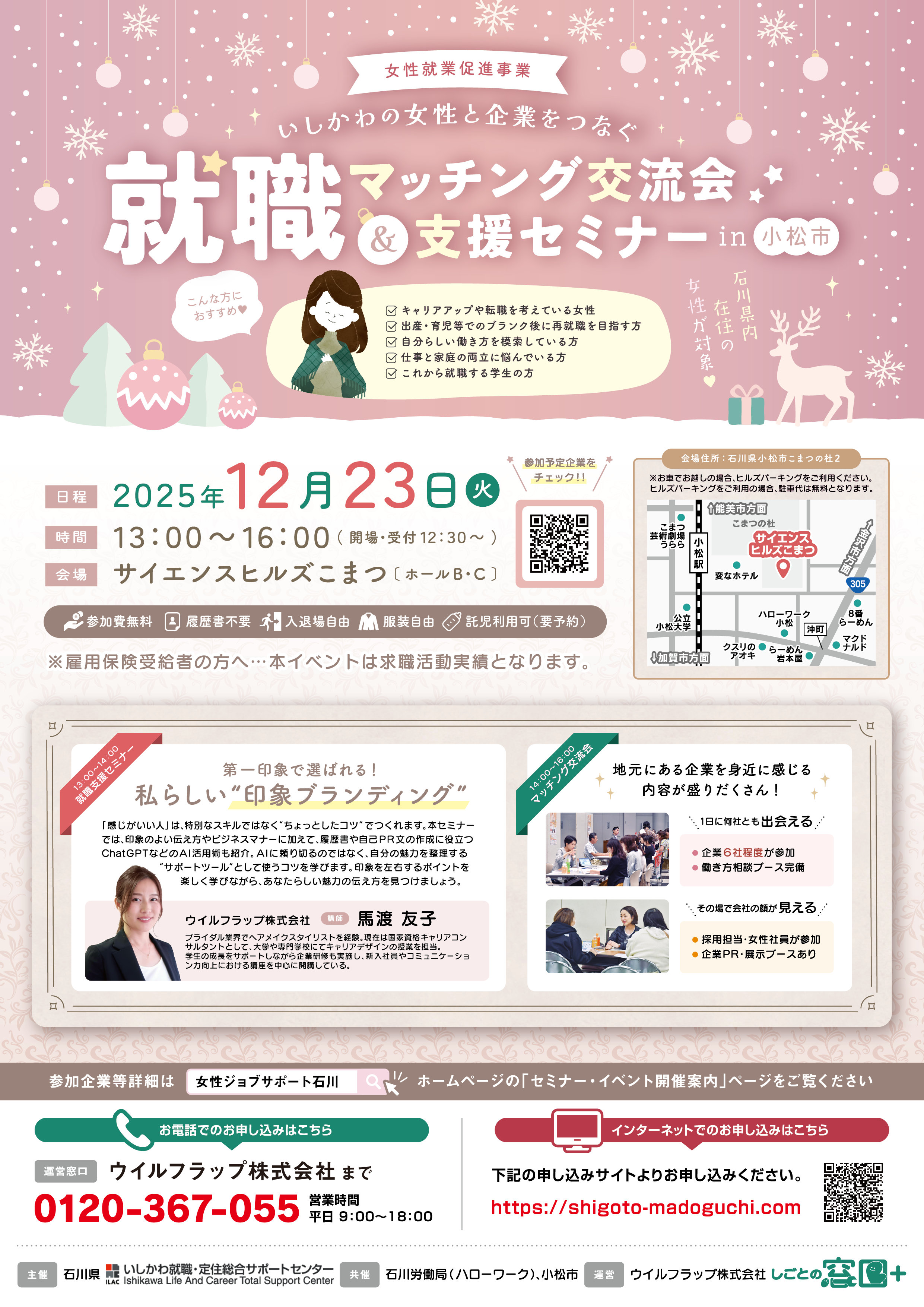 【小松地区】12月23日いしかわの女性と企業をつなぐ就職マッチング交流会&支援セミナーを開催いたします